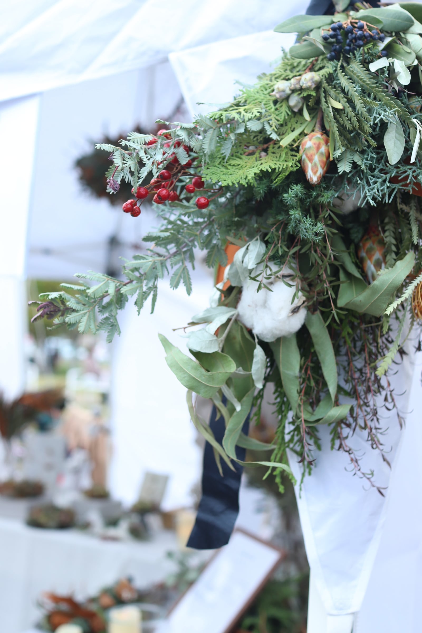 フレッシュのコニファーや香りの良いレモンユーカリに白のコットンツリーや華やかなプルモサム・ドライアンドラのお花を合わせたスワッグ。