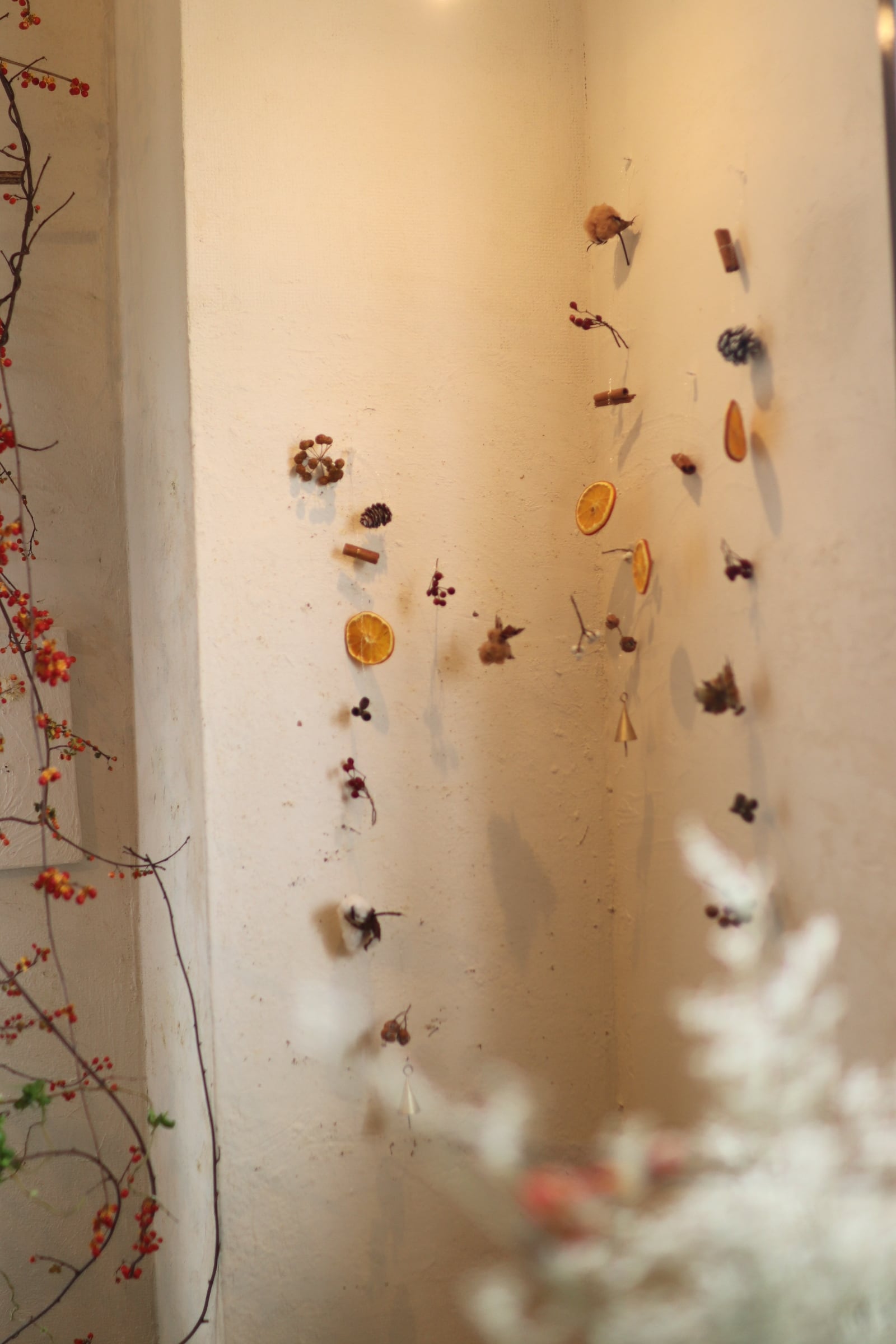 オレンジやサンキライ、松ぼっくりや野ばらの実、シナモンなど、カラフルな素材をワイヤーでリズミカルに繋ぎました。