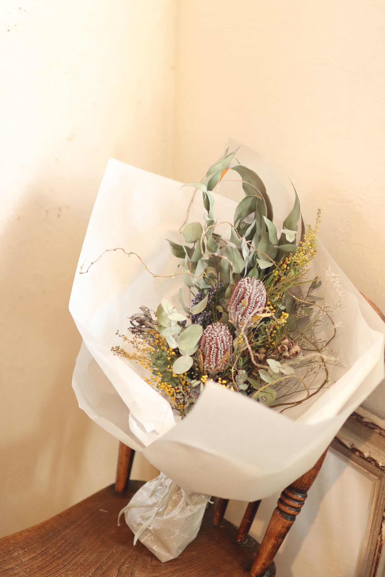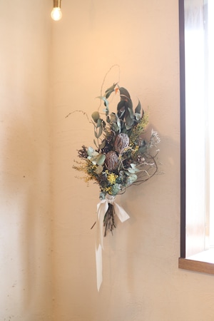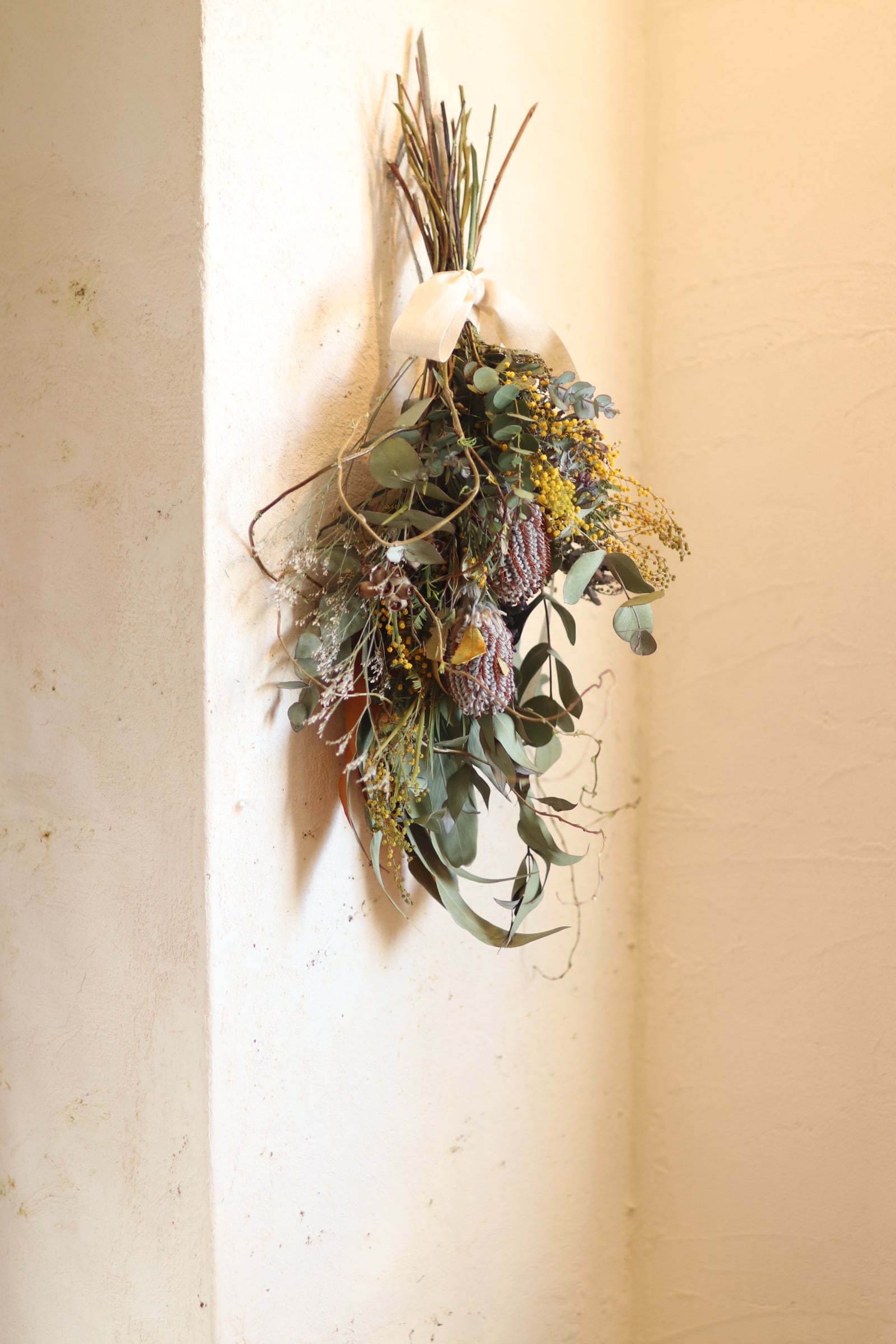 春らしいミモザにオレンジ色が綺麗なバンクシアコクシニアを合わせて、春らしい色使いのブーケスワッグに束ねました。雲竜柳のつるをアクセントに絡ませて、インテリアに馴染むように自然の植物の枝ぶりを生かして束ねています。