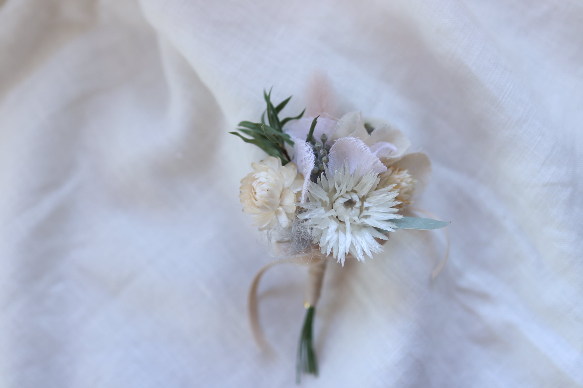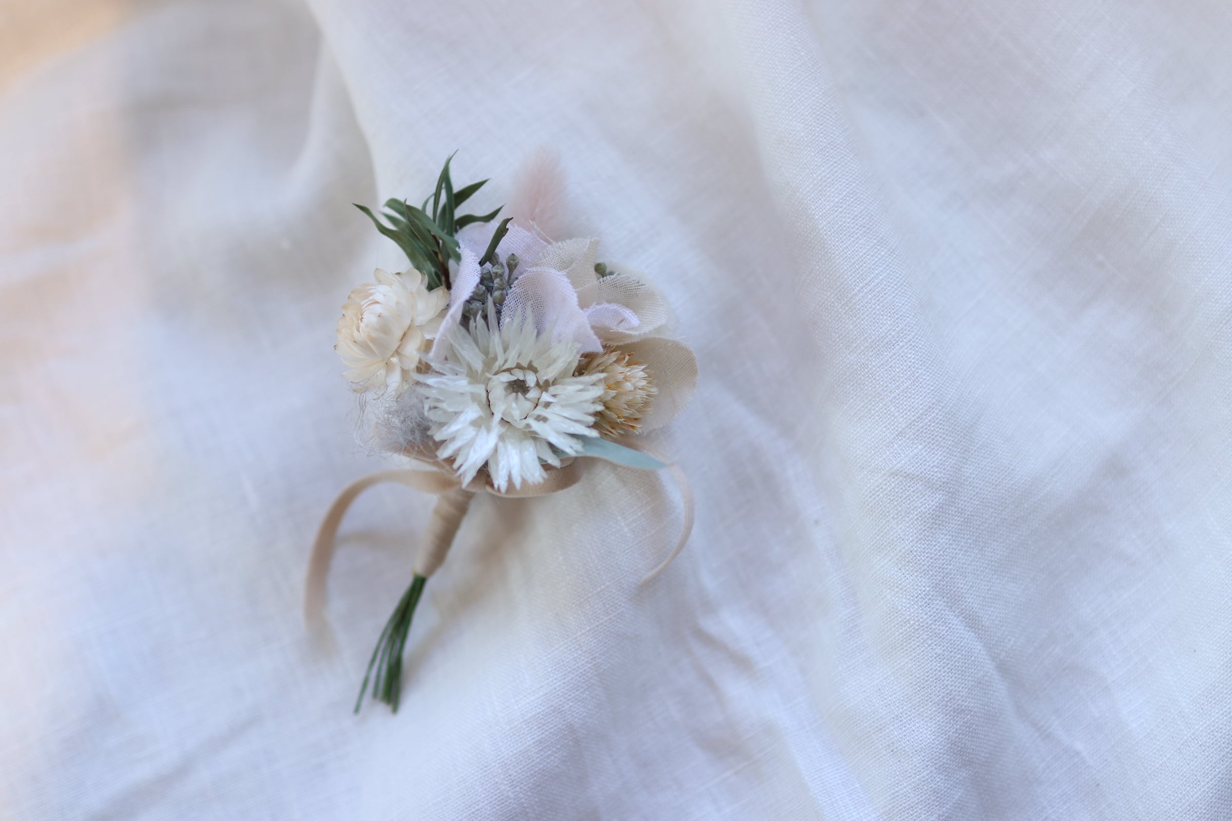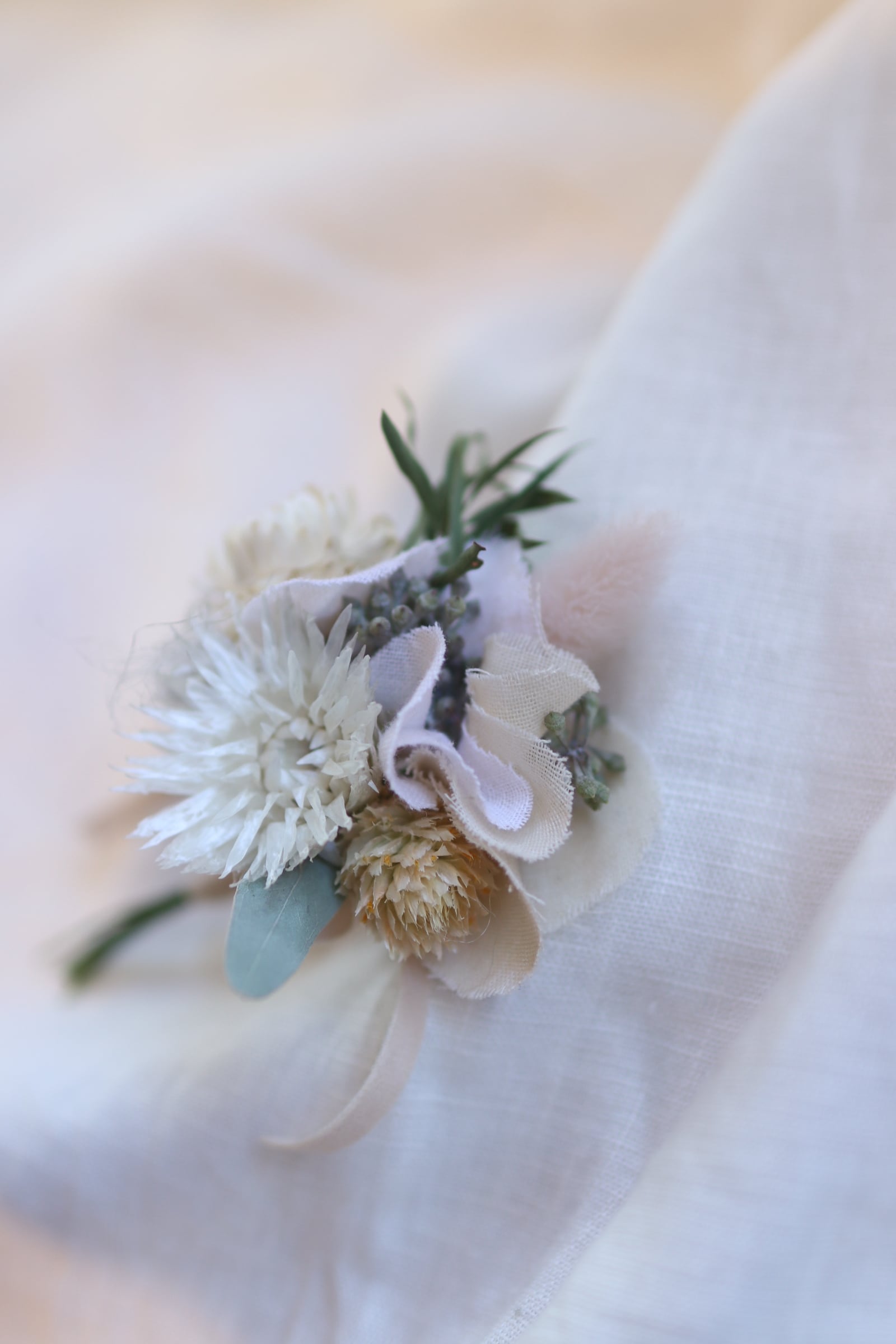 草木染めのコットンガーゼで仕立てた布花とドライフラワーを合わせたコサージュです。
