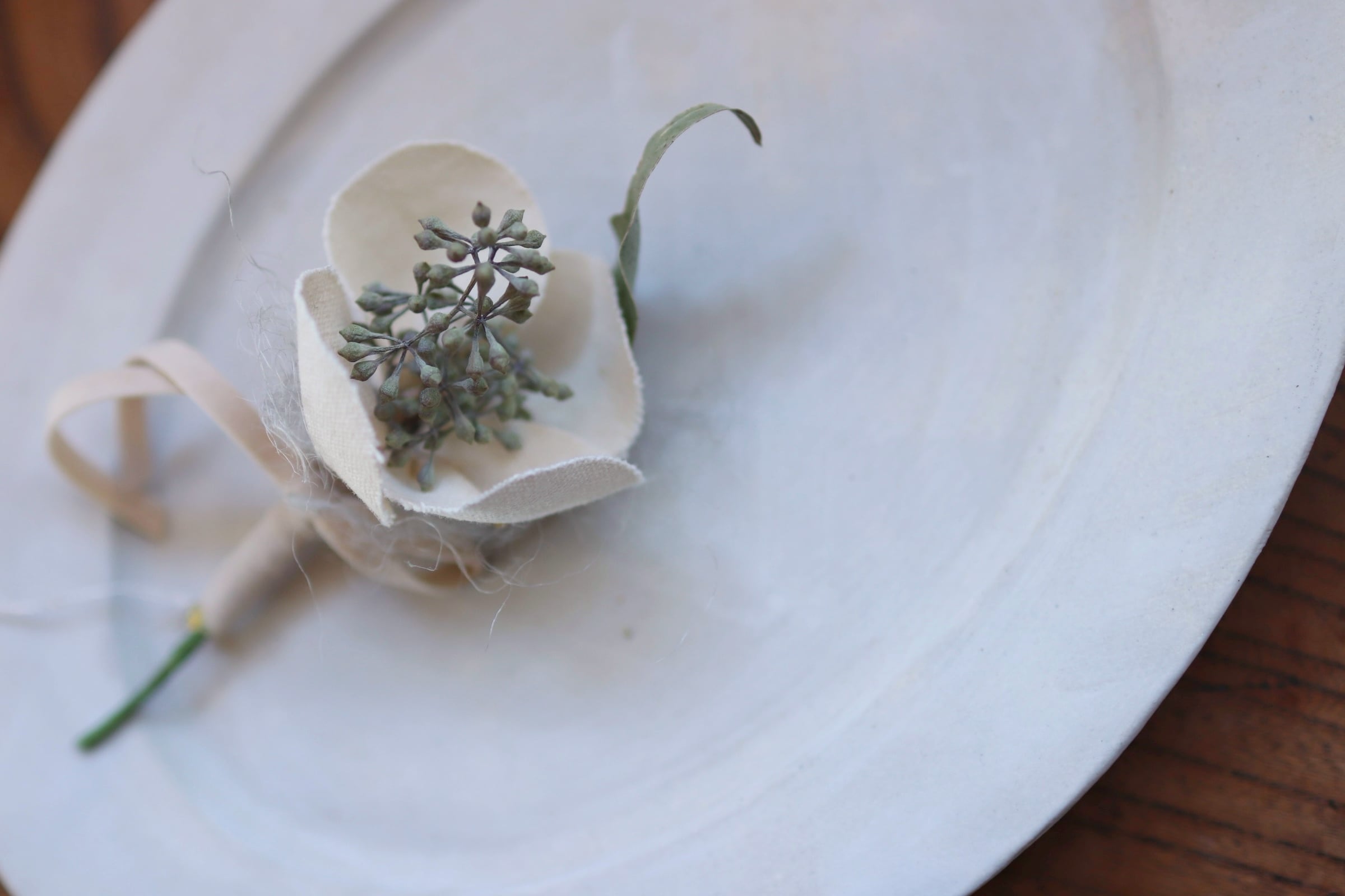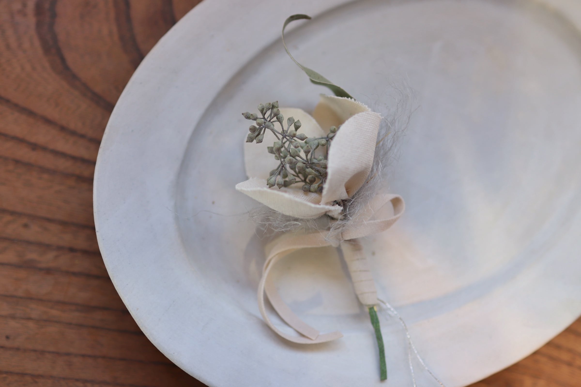 草木染めのコットンガーゼで仕立てた布花とドライフラワーを合わせたコサージュです。
