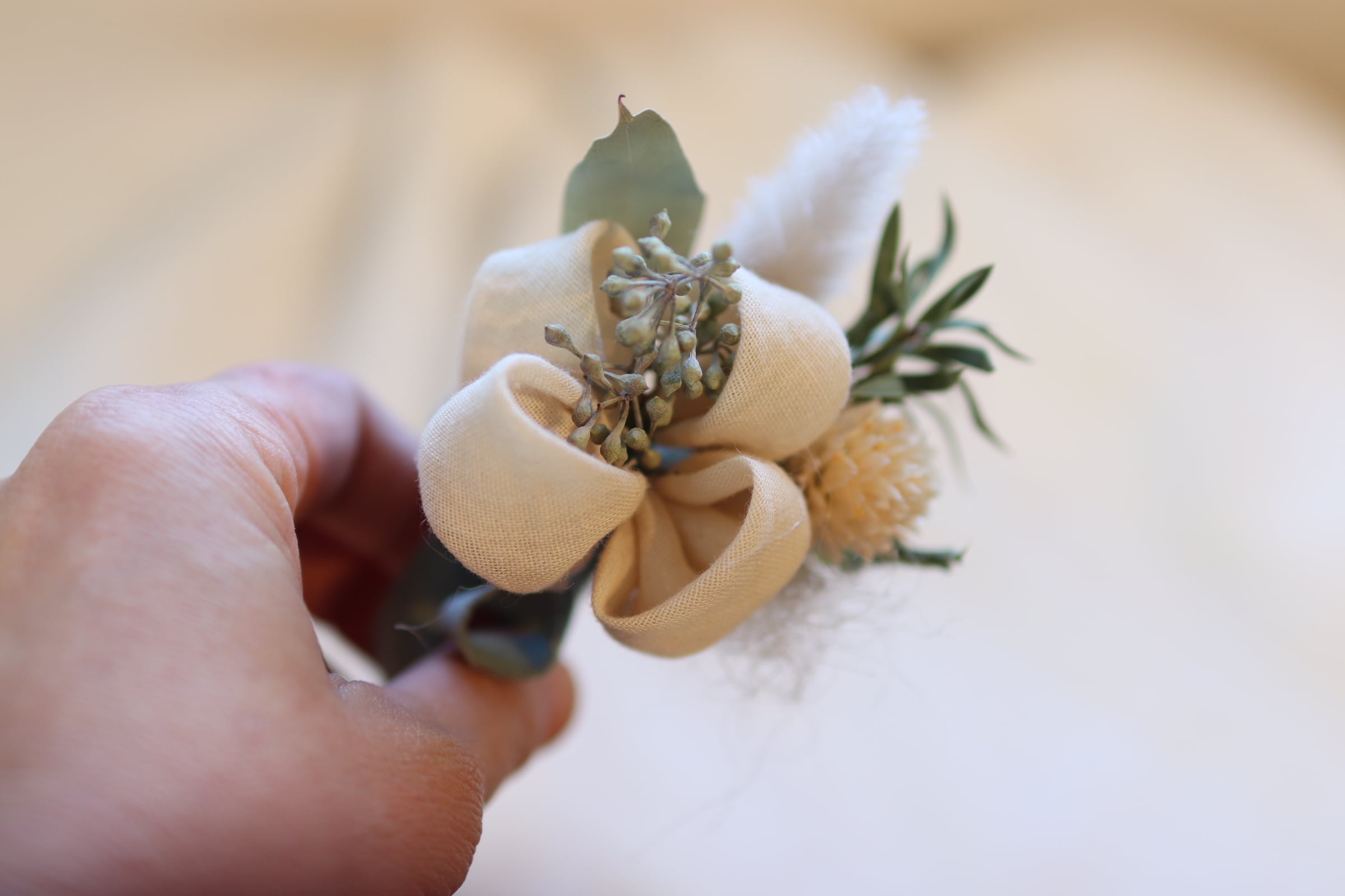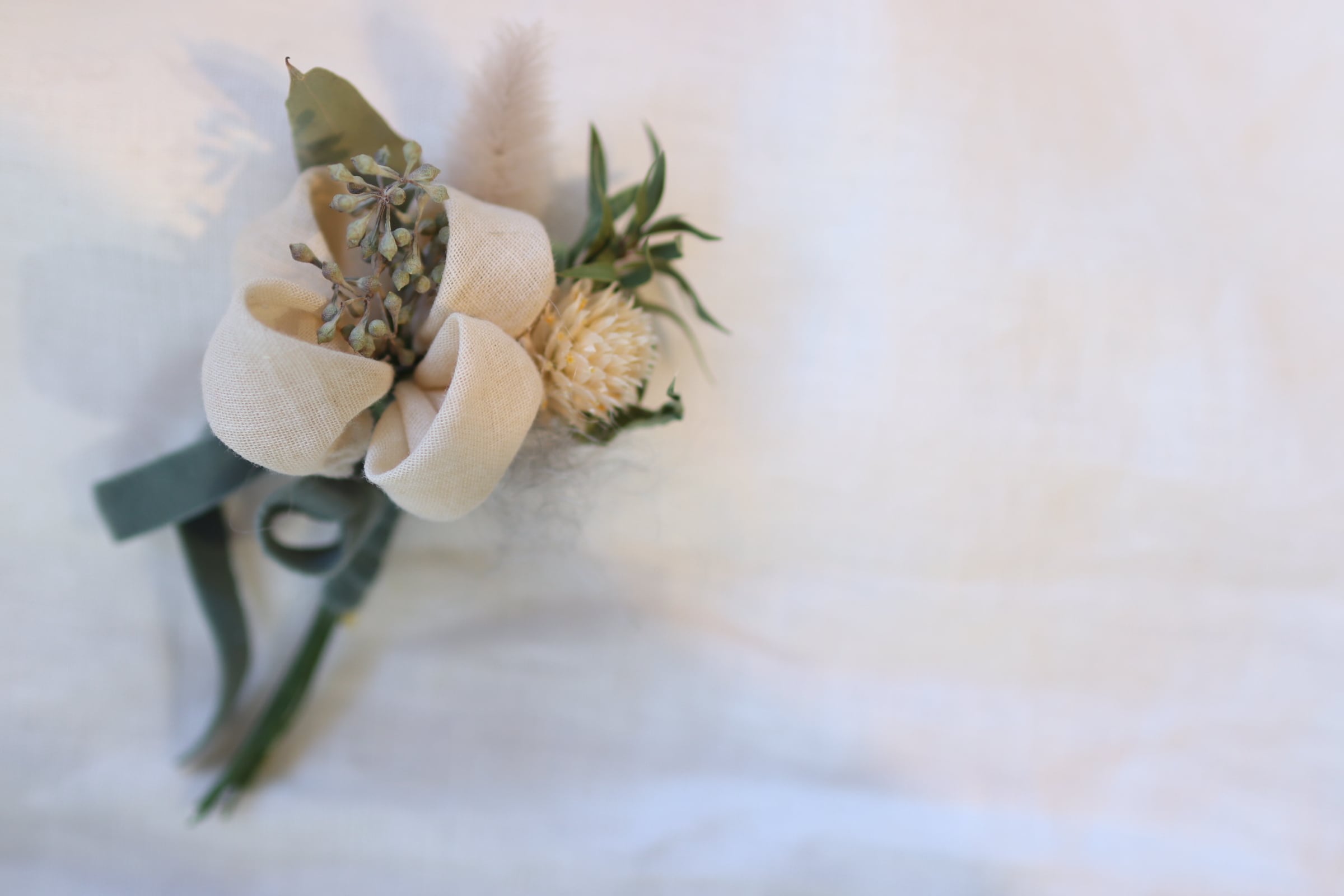 ユーカリで染めたコットンガーゼの布花とドライフラワーを合わせたコサージュです。