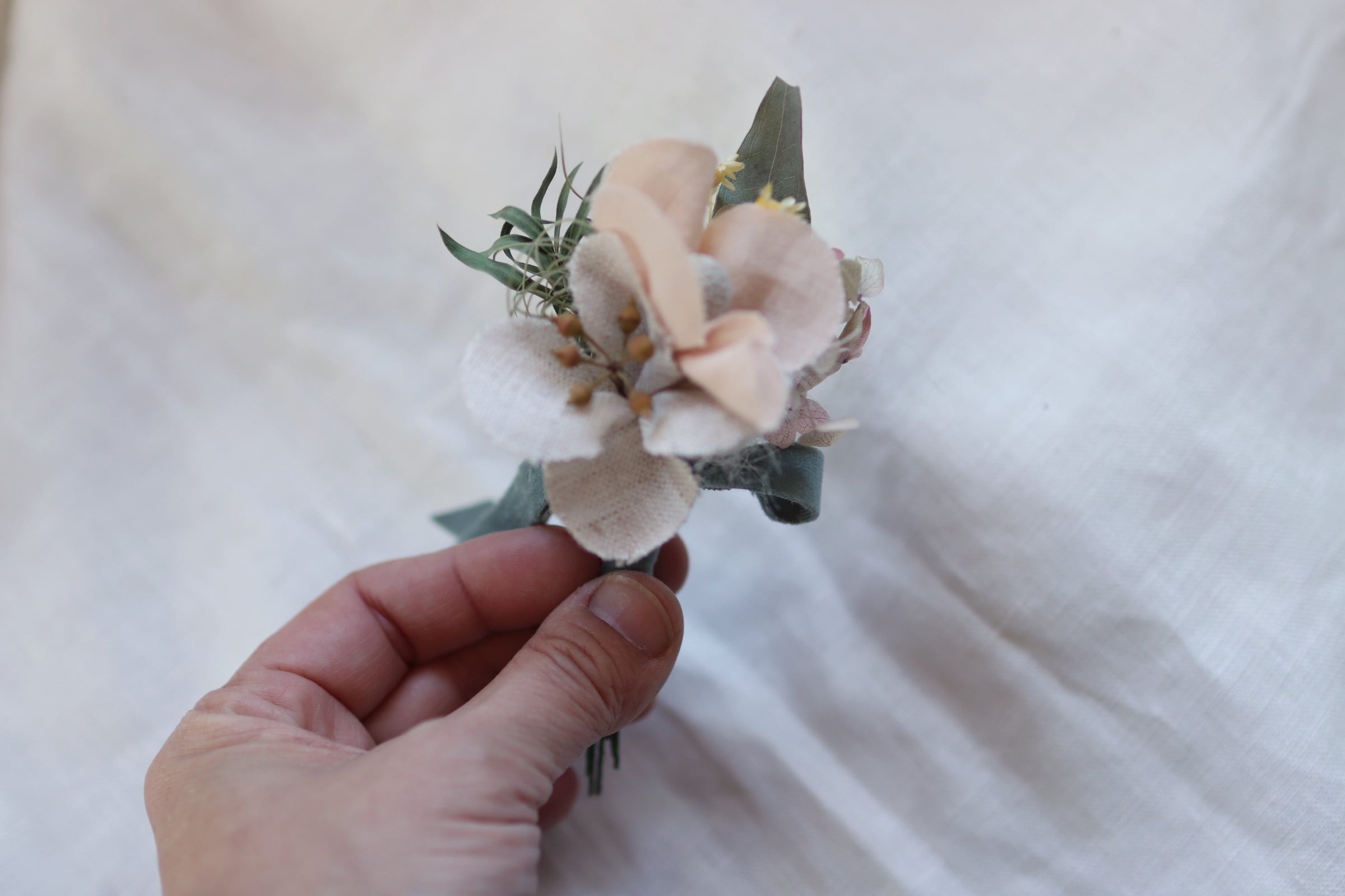 茎の1本1本まで仕事をして、野の花を摘んできたようなコサージュに仕立てました。
