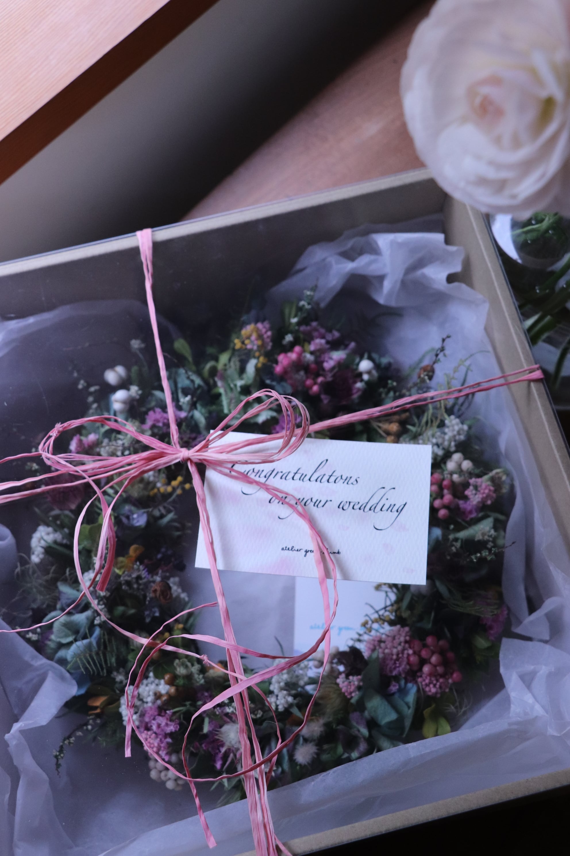 ドライ植物は非常に繊細なため、丁寧に梱包いたしますが、配送中に花や葉が少々落ちる場合がございます。