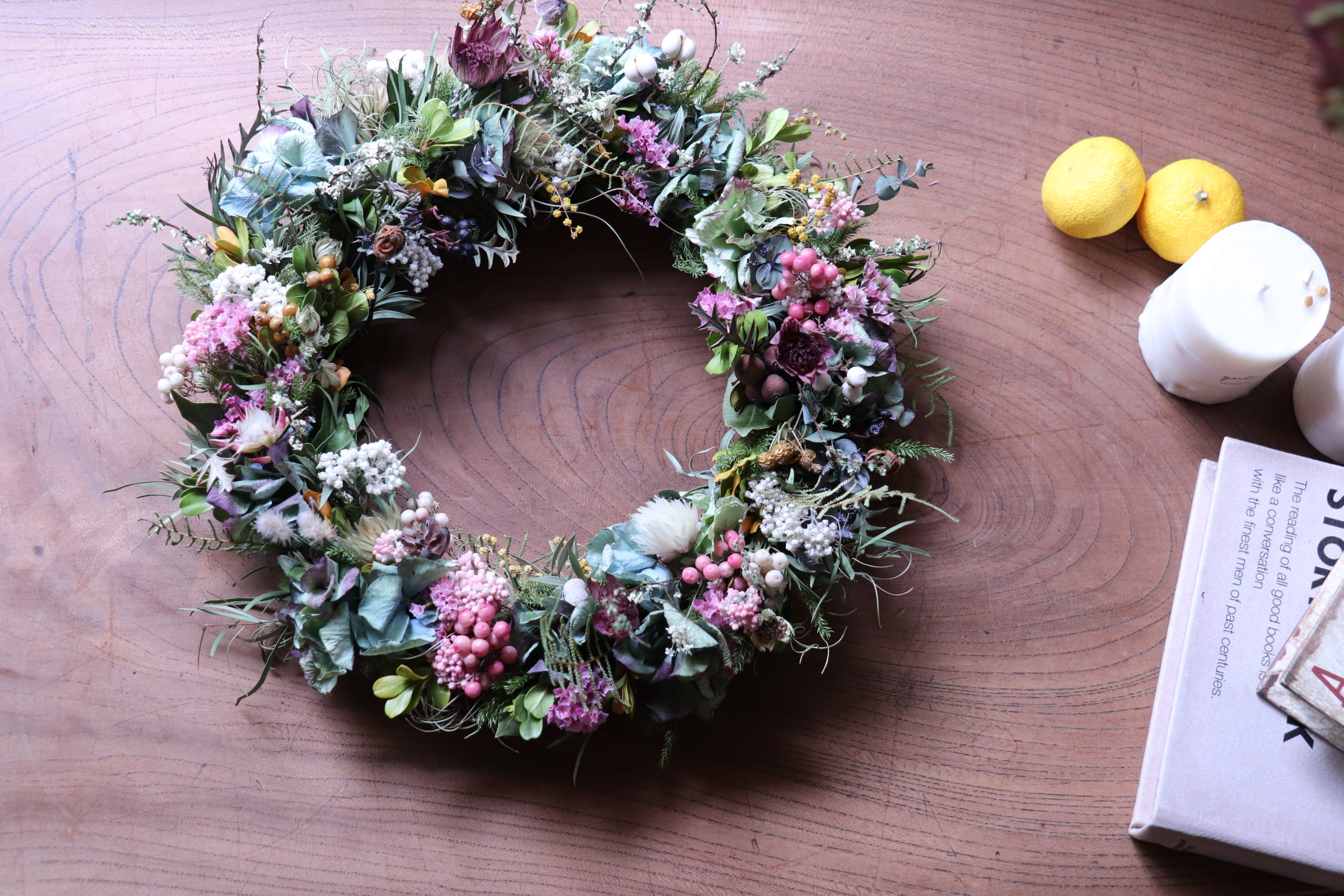 それぞれの草花が共鳴し合いながら、リースは次第に暮らしに馴染み、落ち着いた表情を見せてくれます。その変化する様子もどうぞお楽しみください。